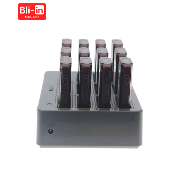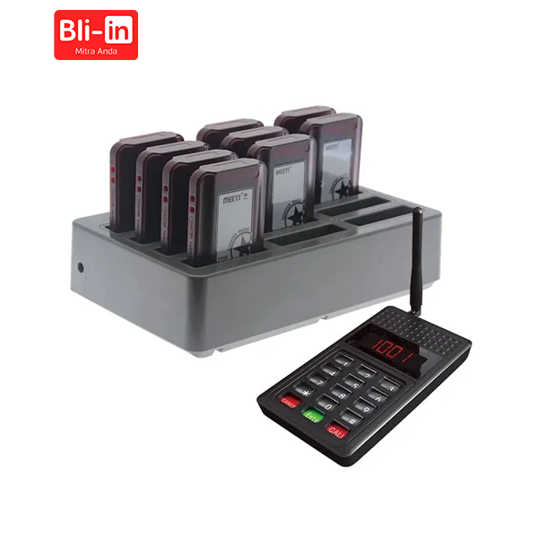 3 mode notifikasi: (1) getaran + LED (2) LED + suara (3) getaran + suara + LED. Kontrol otomatis untuk peringatan jarak. Indikator baterai. Area besar untuk iklan atau desain OEM. Satu set termasuk 1 keypad + 12 pager + 1 basis pengisian.